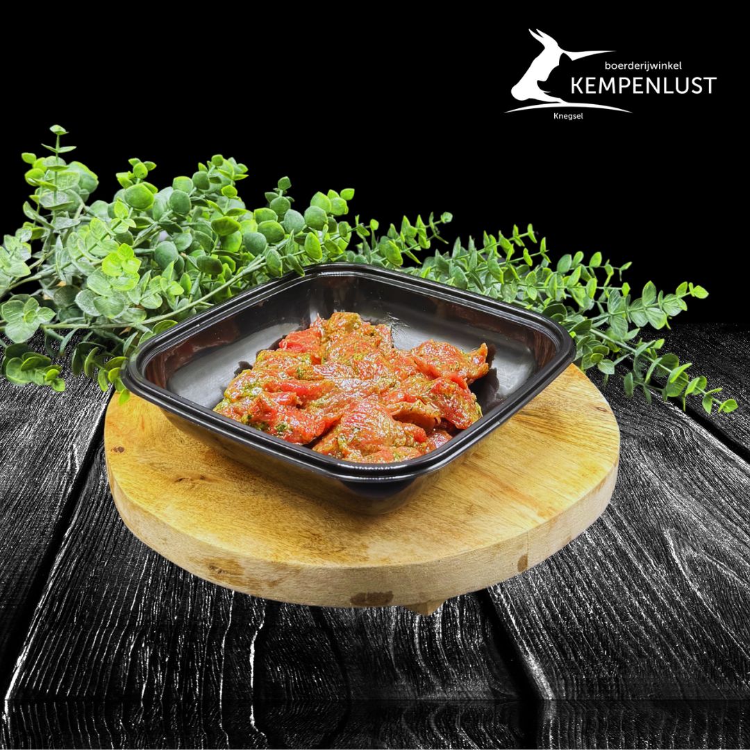 Puur natuur, vers kwaliteits rundsvlees. Gemarineerde biefpuntjes van Boerderijwinkel KempenLust. Met zorg voor dier, rechtstreeks van onze kleinschalige vleesveeboerderij naar jouw bord. Diepvries ready!